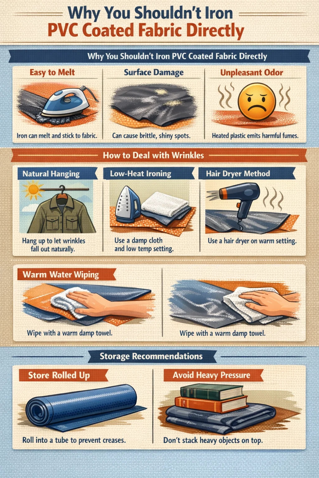 Nízkoteplotní žehlení s látkovou zábranou: Pokud bezpodmínečně musíte použít žehličku, nastavte ji na nejnižší teplotu. Na zadní stranu látky potažené PVC (strana bez potahu) položte tlustou, vlhkou bavlněnou látku jako nárazník. Nikdy nedovolte, aby se žehlička přímo dotýkala látky a udržujte žehličku neustále v pohybu; nikdy nenechávejte na jednom místě.