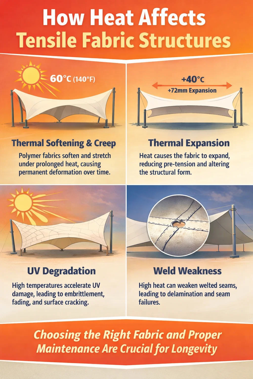 Nejčastější porucha způsobená teplem ve strukturách PVC tahových tkanin není v samotné membráně, ale ve svarových švech. Vysokofrekvenční svařování nebo svařování horkým klínem spojuje PVC s PVC, ale svarová zóna je ze své podstaty nejslabším místem v sestavě membrány. V prostředí s trvalými vysokými teplotami, zejména tam, kde se konstrukce ohýbá při zatížení větrem, se mohou špatně provedené svary oddělit. Určení minima překrytí švů 40 mm a pevnost odlupování sváru vyšší než 150 N/5 cm testování podle EN ISO 1421 je přiměřeným měřítkem kvality pro aplikace v horkém klimatu.