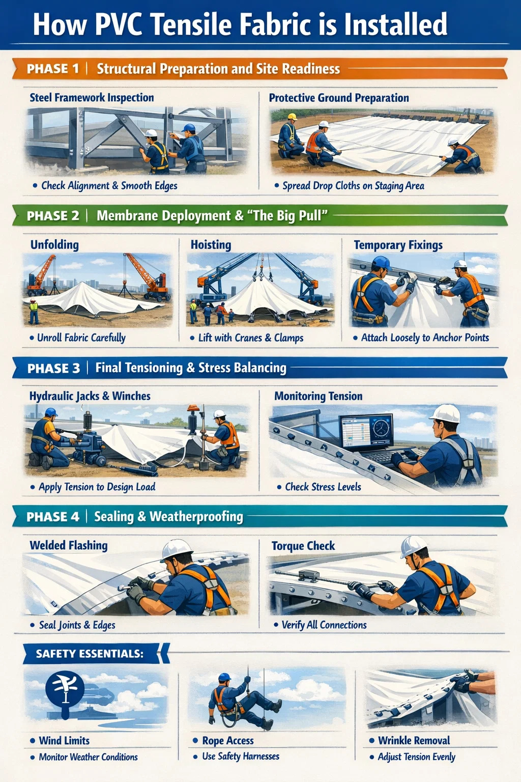 A PVC tažná tkanina struktura je "strukturální" pouze tehdy, když je pod napětím. Bez správného napnutí by se látka ve větru chvěla, což by způsobilo únavu a případné selhání. Tato fáze zahrnuje přitažení látky k ní úrovně předpětí , obvykle v rozmezí od 1,0 až 5,0 kN/m v závislosti na technických požadavcích.