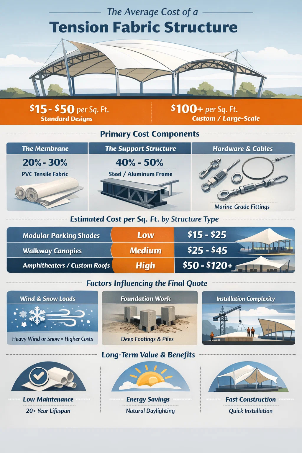 Cena struktury napínací tkaniny se obvykle pohybuje od 15 až 50 dolarů za čtvereční stopu pro standardní návrhy, zatímco vysoce přizpůsobené nebo rozsáhlé architektonické projekty mohou překonat 100 dolarů za čtvereční stopu . Tato cena není jen pro PVC tažná tkanina sám; zahrnuje kompletní systém včetně ocelové konstrukce, specializovaného hardwaru, základových prací a odborné instalační práce. Protože jsou tyto konstrukce konstruovány na zakázku, aby vydržely specifické zatížení větrem a sněhem, ceny kolísají v závislosti na geografické poloze a složitosti návrhu.