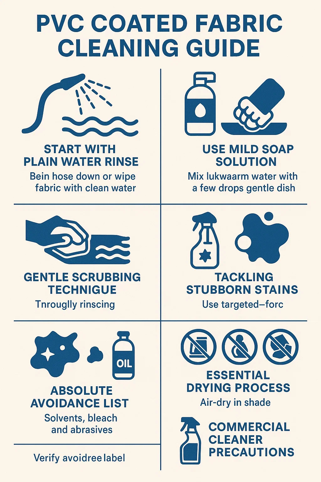 Zde je praktický návod na čištění Tkaniny potažené PVC na základě společných zkušeností a péče o materiál: