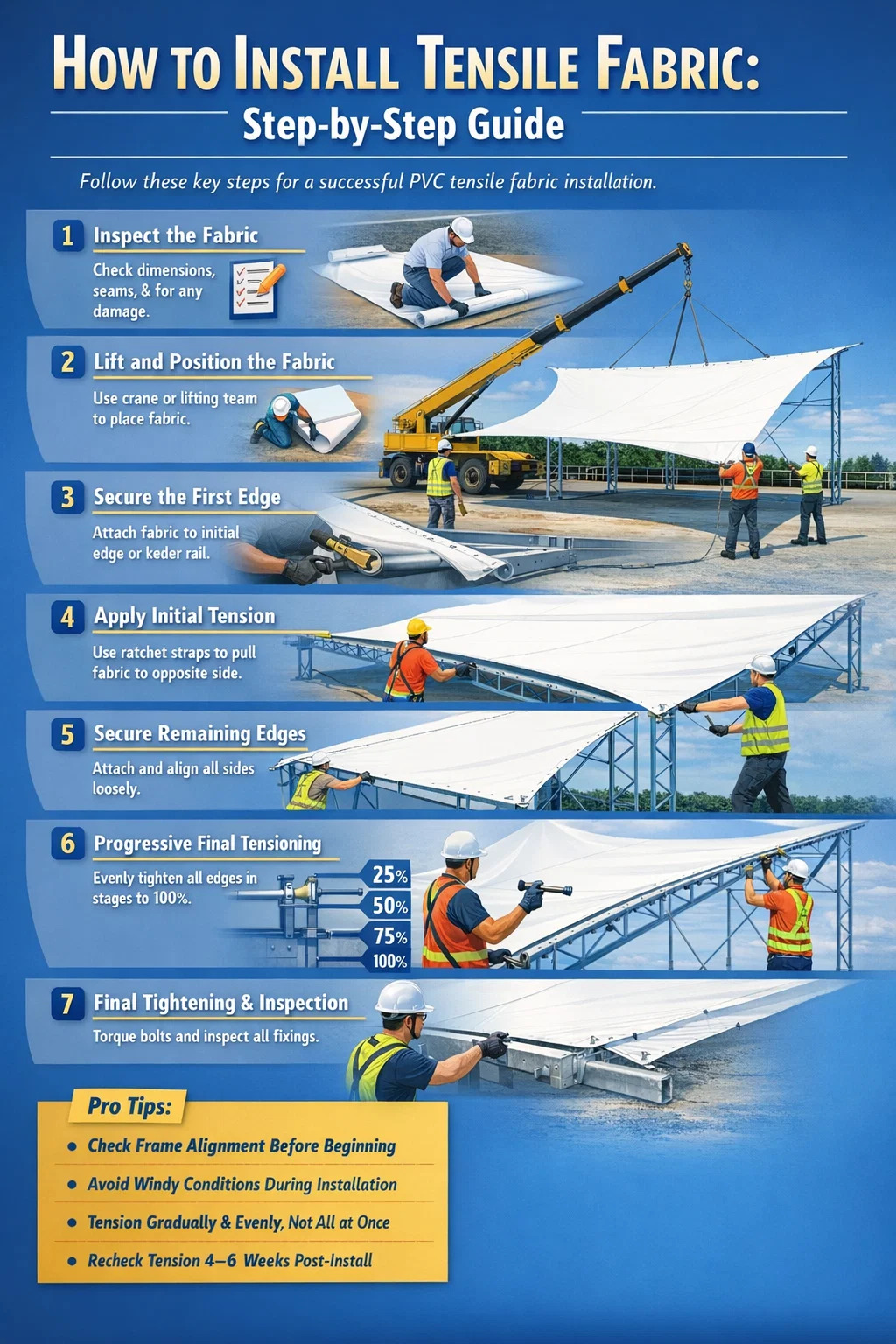 Instalace tažné tkaniny – zvláště PVC tažná tkanina — vyžaduje strukturovanou sekvenci: příprava místa, montáž rámu, rozvinutí a umístění tkaniny, napnutí okrajů a konečné ukotvení. Tento proces není jen o utahování materiálu; zahrnuje vypočítané rozložení napětí, aby se zabránilo deformaci, prověšení nebo předčasnému selhání. Při správném provedení může správně nainstalovaná PVC struktura tažné tkaniny vydržet 15 až 25 let s minimální údržbou.