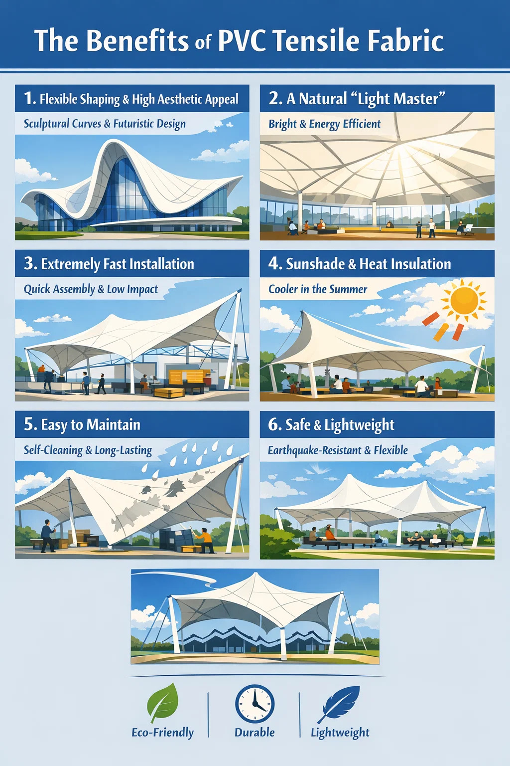 Když už mluvíme o výhodách PVC tažná tkanina , jeho popularita v moderní architektuře, zejména na stadionech, venkovních náměstích a zastínění krajiny, pramení z mnoha jedinečných výhod oproti tradičním materiálům.
