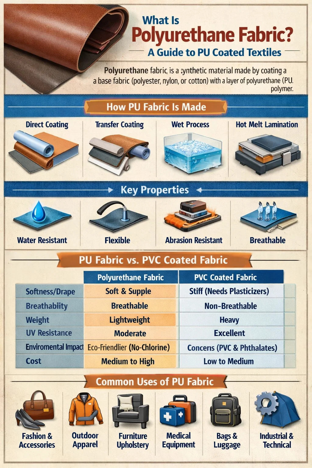 Na rozdíl od tkaných nebo pletených tkanin získává polyuretanová tkanina své určující vlastnosti ze samotného PU povlaku, který může být navržen pro specifické vlastnosti: voděodolnost, prodyšnost, měkkost nebo tuhost. PU povlak obvykle tvoří 15–60 % celkové hmotnosti materiálu , v závislosti na zamýšleném konečném použití.