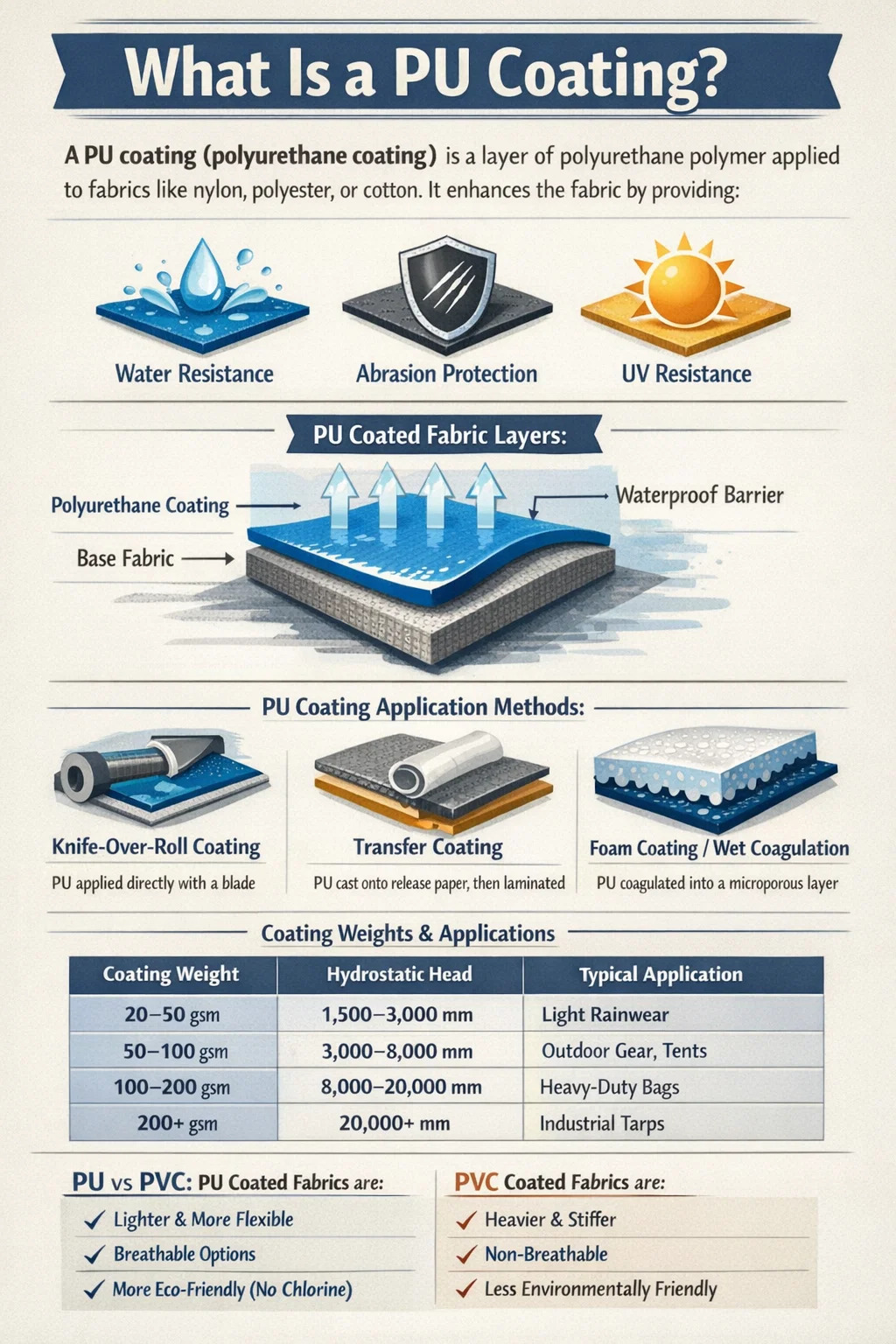 Prakticky řečeno, když manipulujete s látkou potaženou PU, dotýkáte se materiálu, který byl navržen tak, aby se choval velmi odlišně od svého nepotaženého protějšku. Polyuretanová vrstva má typicky tloušťku od 0,05 mm do více než 1,5 mm , v závislosti na konečném použití – lehká tkanina na oblečení do deště může mít tenký povlak pouze 20–30 gramů na metr čtvereční (gsm), zatímco průmyslová plachta pro velké zatížení může mít povlak přesahující 200 gsm.