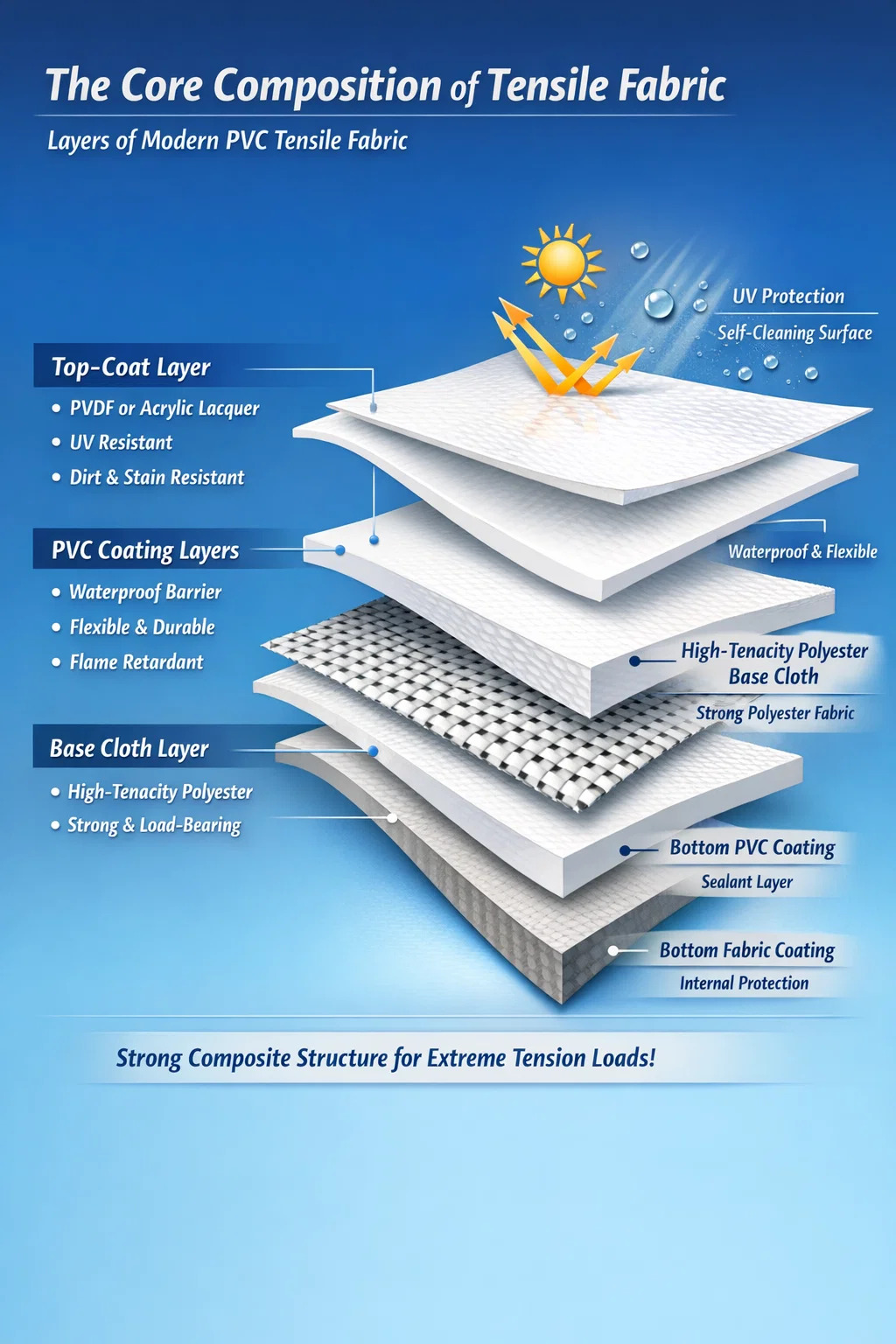 Nejmodernější PVC tažná tkanina je sofistikovaný kompozitní materiál sestávající ze tří primárních vrstev: a vysoce pevná polyesterová základní tkanina , tlustý Povlak z PVC (polyvinylchlorid). a specializovaný vrchní lak jako je PVDF nebo akryl. Vnitřní tkanina poskytuje strukturální pevnost pro zvládnutí masivního tahového zatížení, zatímco vnější plastové vrstvy chrání vlákna před degradací prostředí, vodou a ohněm.