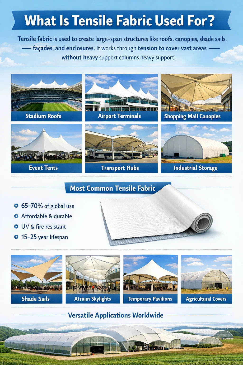 Kromě prestižních architektonických projektů odvádí tahová tkanina značnou praktickou práci v průmyslových a zemědělských kontextech – v oblastech, kde na ceně za metr čtvereční a rychlosti erekce záleží mnohem více než na estetice.