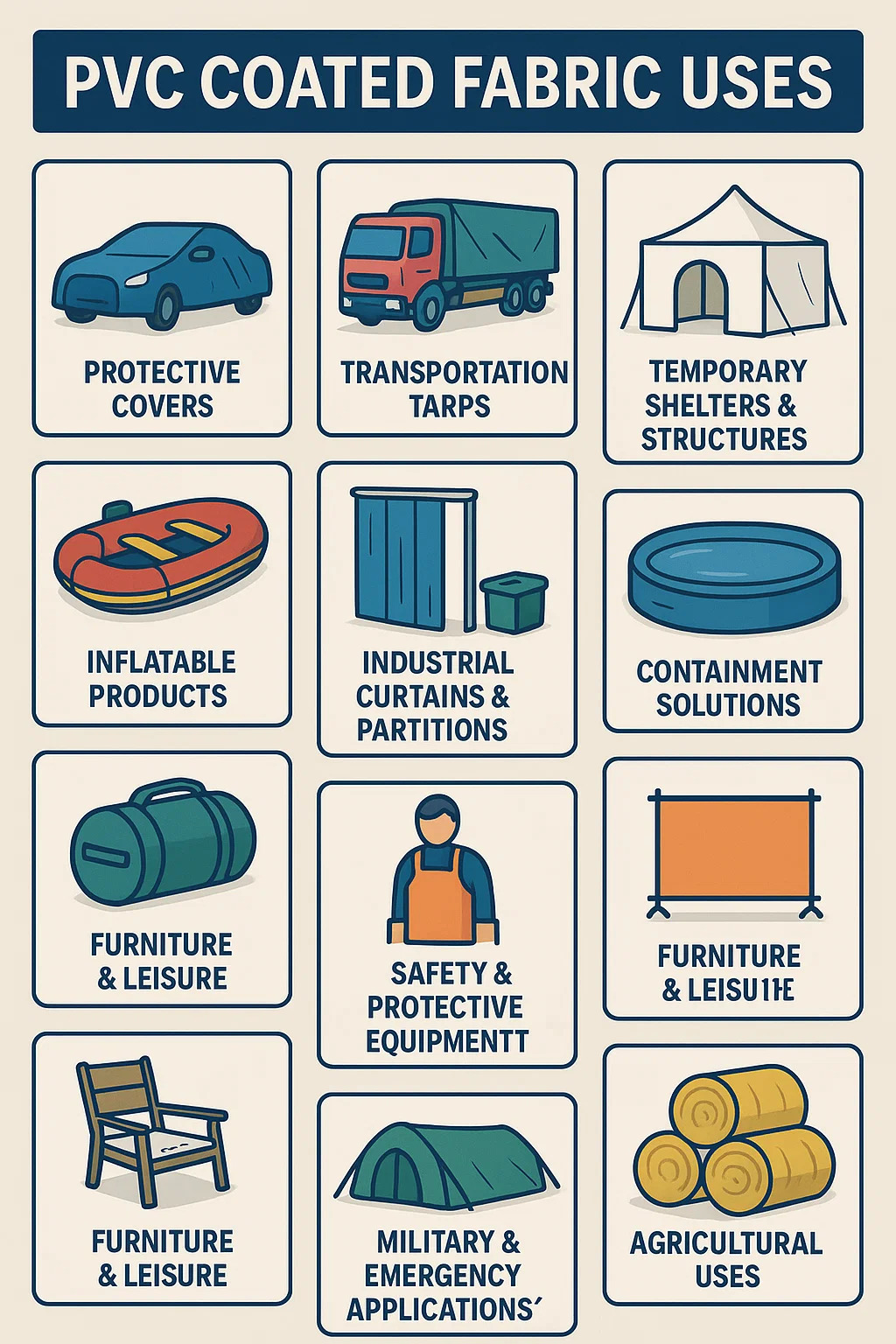 Zde je rozpis běžných použití pro Tkanina potažená PVC , odrážející jeho praktické aplikace: